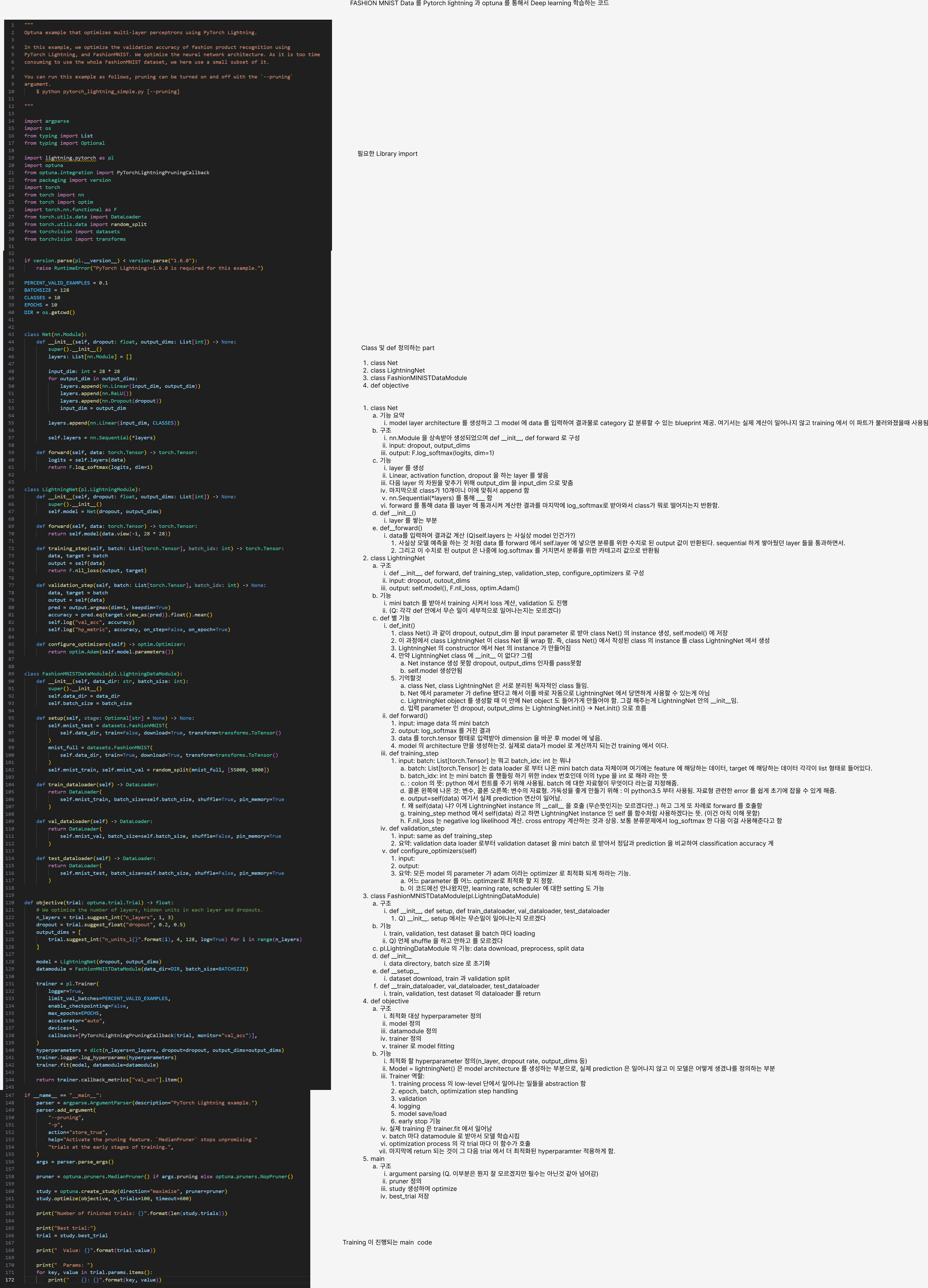 그래서 그 다음으로 생각해 낸 것이 Google 에서 pytorch 에 optuna 로 hypermarameter tuning 이 자동으로 optimization 되는 제대로 검증 된 예제 code를 찾고, 이를 첨부하여 이에 대해 하나하나 설명해달라는 프롬프트를 만들었다. 물론 프롬프트는 한 번 생성하고 그에 대한 답을 본다 그래서 이해할 수 있는 것이 아니라, 수십개의 꼬리질문을 하며 아래와 같이 해석하는 일을 했으며 어디에 정리할까 하다가 최종적으로는 스크롤을 무제한으로 할 수 있는 figma에 하기로 했다. 아래가 바로 그 figma 화면의 스크린샷 이미지이다.