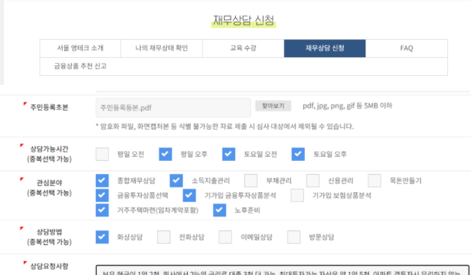 이 화면을 클릭하면 아래와 같은 화면으로 이동하게 되는데, 여기서 무료 자산관리 상담가능 시간, 재테크 관심분야, 상담방법 (화상, 대면, 전화 등)을 선택할 수 있다. 마지막으로 상담 요청사항을 간략하게 적어서 자신의 현재 자금 상태, 상담 받고자 하는 내용등을 적을 수 있다. 그리고 이것들을 하기 전에 준비물이 있다. 주민등록초본이 pdf, jpg, png 등의 형태로 저장되어 있어야 한다. 신청하기 전에 참고로 알아두면 미리 준비할 수 있어 좋다.