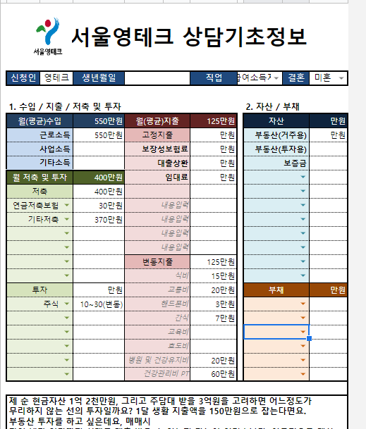 신청이 완료되면, 잠시 후에 엑셀파일을 작성하여 상담 전에 미리 제출하라는 내용의 안내를 받게 된다. 마치 로버트 기요사키의 <부자아빠 가난한아빠> 책에 나온 현금흐름표와 유사한 형태의 엑셀파일인데, 이곳에 월별 소득, 저축액, 투자 금액, 지출금액 등을 적게 되어 있다. (참고로 변동지출 밑에 회색으로 된 부분은 내가 따로 추가한 부분이다). 맨 밑에는 자신의 재무 고민을 길게 적을 수 있는 칸이 마련되어 있어 상담사가 상담 전에 내가 어떤 고민을 갖고 있는지 알 수 있게 할 수 있다.