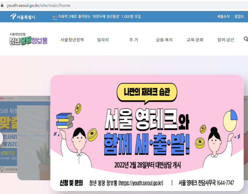 youth.seoul.go.kr 에 접속하면 아래와 같이 메인 화면에 서울 영테크 상담 신청 페이지로 가는 화면이 나온다.