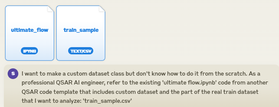 기존 신약개발 부트캠프때 연습했던 자료를 정리하여 ‘ultimate_flow.ipynb’ 라는 이름으로 저장하고 현재 신약개발 경진대회에서 사용될 train dataset 의 일부를 sampling 하고 값을 변형하여 csv file 저장했다. 이 2개의 file을 올리면서 ‘ultimate_flow.ipynb’ 에 나온 code 스타일로 training 용 csv file data 를 custom dataset 으로 읽어오는 code 를 만들라고 했다.