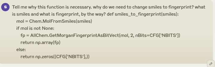 프롬프트에서는 왜 smiles 를 fingerprint 로 전환해야 하는지, 그리고 애초에 smiles 는 뭐고 fingerprint는 뭐냐고 물어봤다.