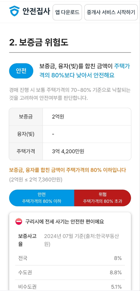 위의 내용을 보면 감이 오겠지만 개인이 저 질문들을 하나 하나 살펴가며 대답하는게 어려운 질문도 있다. 그래서 내가 추천하는 방법은 안전집사 어플을 다운받아서 1900원을 내면 전세 사기로부터 안전한 집인지를 진단 받을 수 있는 리포트를 제공 받을 수 있는데 그 리포트 항목중 하나가 ‘전세금반환보증 가입 가능여부’ 이다. 참고로 아래 스크린샷은 내가 전세를 알아보며 실제로 받은 리포트 내용이다. 이 외에도 보증금 위험도, 악성임대인 명단확인 링크 등을 제공해줘서 쉽게 확인 할 수 있게 해 준다.