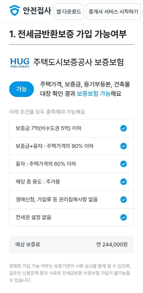 위의 내용을 보면 감이 오겠지만 개인이 저 질문들을 하나 하나 살펴가며 대답하는게 어려운 질문도 있다. 그래서 내가 추천하는 방법은 안전집사 어플을 다운받아서 1900원을 내면 전세 사기로부터 안전한 집인지를 진단 받을 수 있는 리포트를 제공 받을 수 있는데 그 리포트 항목중 하나가 ‘전세금반환보증 가입 가능여부’ 이다. 참고로 아래 스크린샷은 내가 전세를 알아보며 실제로 받은 리포트 내용이다. 이 외에도 보증금 위험도, 악성임대인 명단확인 링크 등을 제공해줘서 쉽게 확인 할 수 있게 해 준다.
