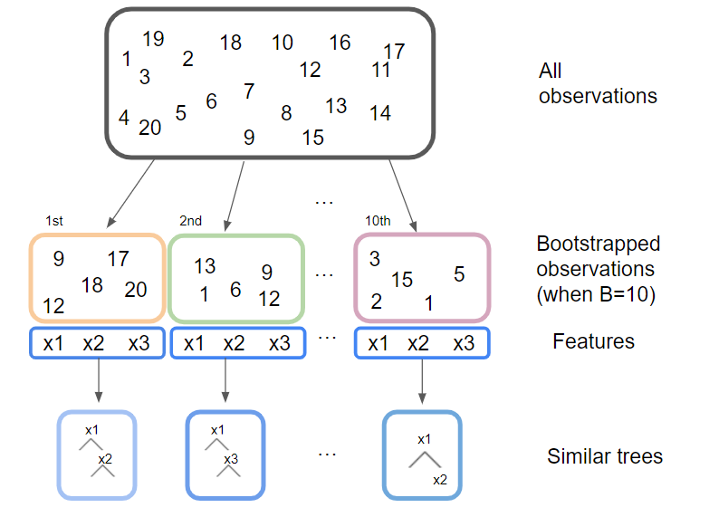 Bagging 원리를 요약한 모식도. (본인이 직접 작성한 그림이므로 무단 도용을 금지합니다.)