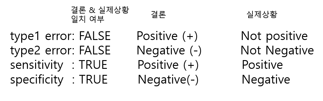 그렇다면 실제로 Positive인 결과 일 때 그에 맞게 귀무가설을 잘 기각하는 확률은 1-alpha가 되며 이를 민감도 (sensitivity)라고 한다. 그리고 반대로 실제로 negative한 결과 일 때 그 에 맞게 귀무가설을 기각하지 않은 확률을 1-beta로 표현하며, 이를 특이도 (specificity), 또는 statistical power라고 한다. 즉, statistical power가 높을수록 type 2 error를 저지르지 않을 확률이 올라가는 것이고 보통 80%가 되는 것이 바람직한 것으로 본다 (즉, 이때 type 2 error 발생 확률은 100-80 = 20%가 된다.)